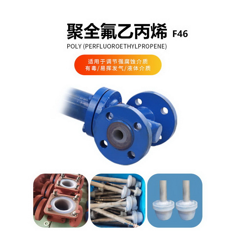 閥體內腔、閥芯、閥座、閥桿均包襯2.5~3mm厚的F46,能耐酸、堿,耐強腐蝕